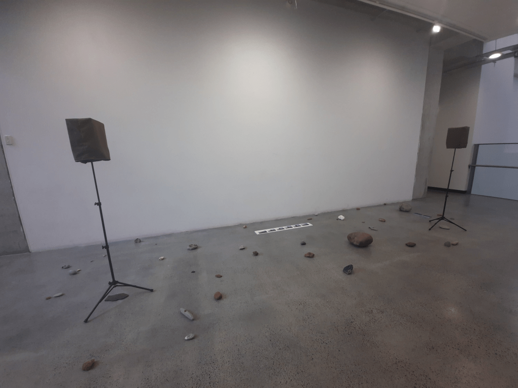 Materials: Audio work, speakers, personal stone collection sourced over the north Island NZ. Photograph series x2, boulder x2. Installation with audio component.