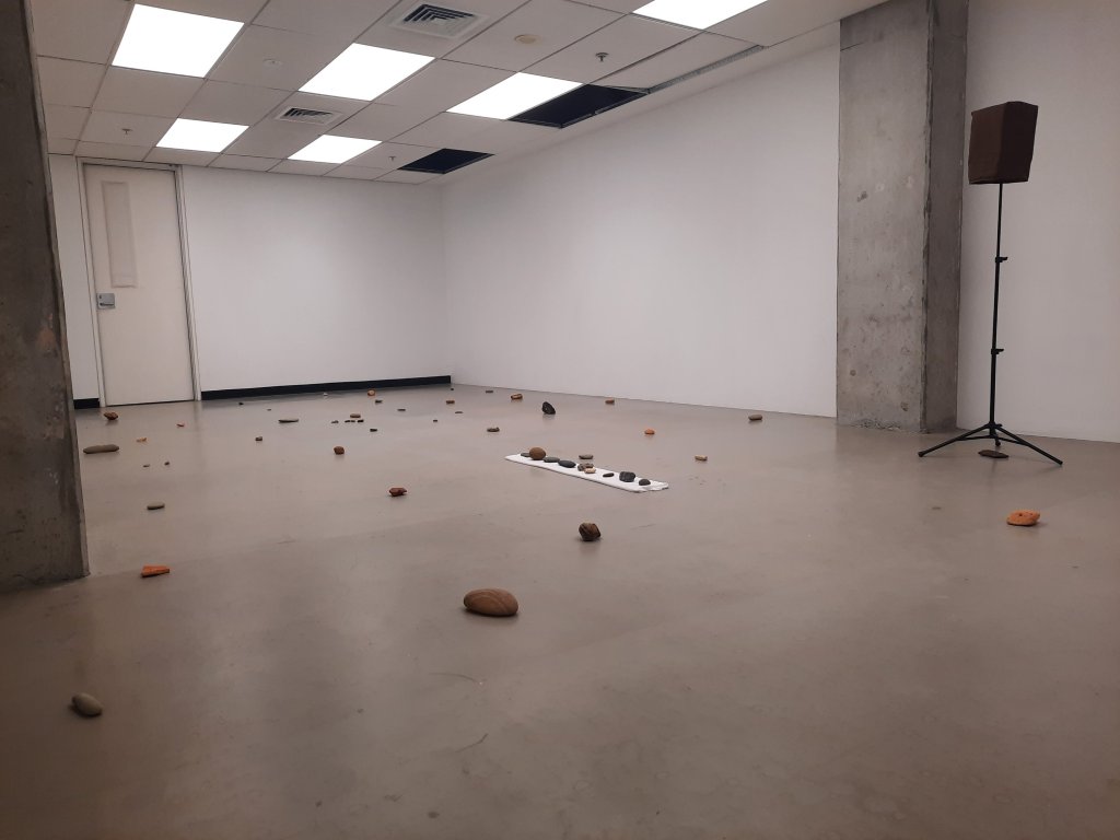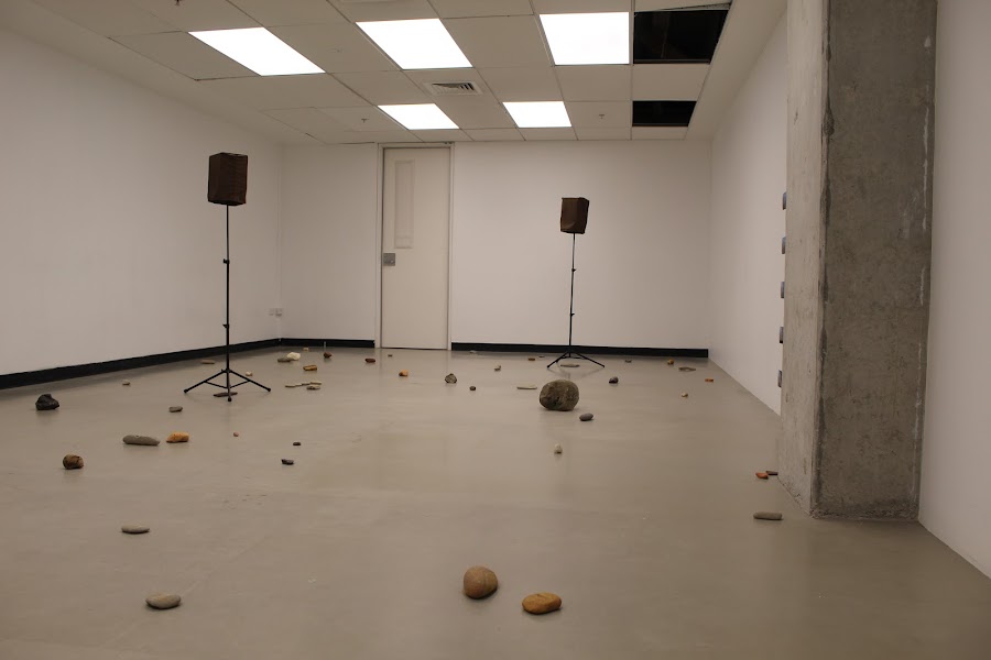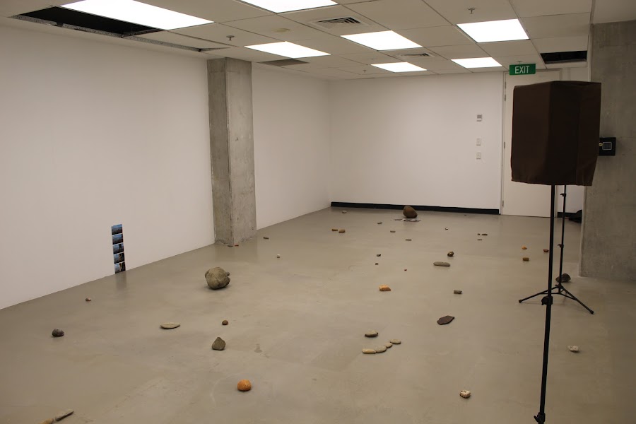 The sound emits as an unseen layer resting over the seen rocks. It is through this dynamic relationship that I have created an experience in my installation. I wish to see the audience engage with a sense of wonder as they listen to the sounds played. What so the sounds and rhythms evoke when considering stones. In many regard the stones scattered throughout the installation are in essence, scattered memories.