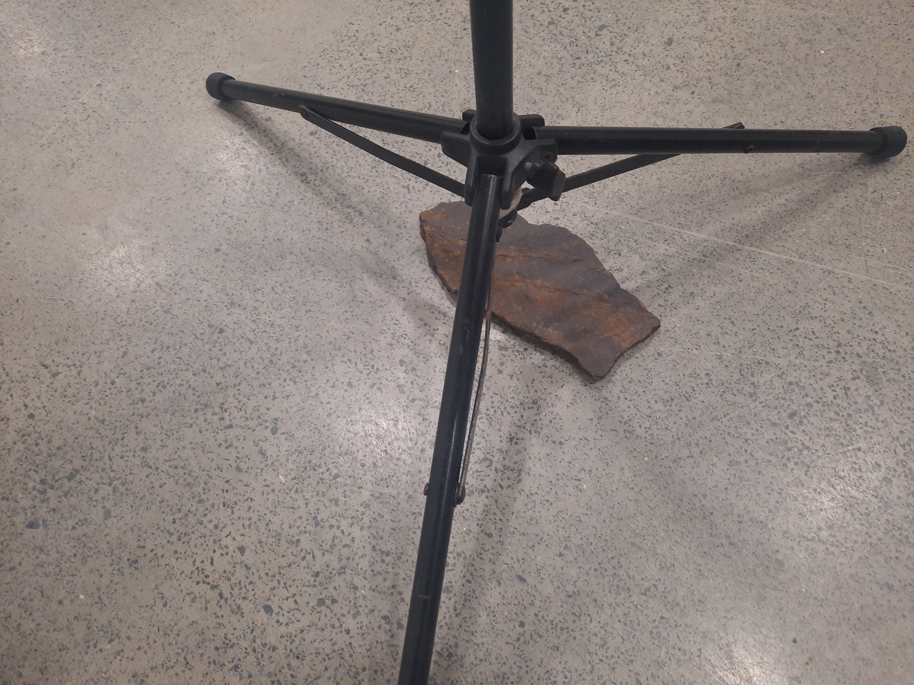 I have brought together aspects from my previous works, refining their impact within the overall impact of the installation. Introducing two sounds playing into the space, I have extended the use of the personified speaker. The two speakers are placed at a opposing ends facing each other. I measured using my feet = 6 out and 7 in. One speaker represents the collectors sound and the other is the sound from the stones.