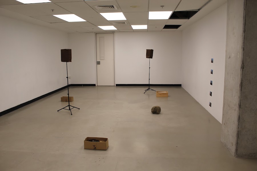 Bringing my discoveries into an installation I used one speaker to play the digitalized stone sounds. In the center of the room I have brought attention to a specific set of rocks used to create the sonic sounds by placing them on a fabric white board. Throughout the room I have thoughtfully placed the stones in relation to marks made within the room prior to me using it. Creating space for each rock to rest I have clearly identified to the audience the value placed on the stones.