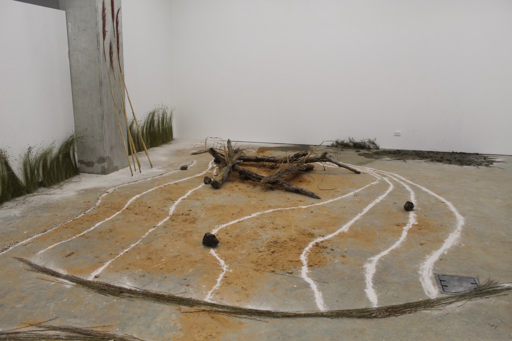 Collected from the coastal wetlands along the Turanga Creek located in Whitford, East Auckland, New Zealand: Clay at various stages of heat engagement, silt, shell/ calcium dust under heat processes, and salt water. Found decaying wood, Toetoe, Glass wort, Tussock grass, and reeds. Shell and clay dust from previous installations.